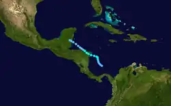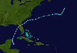 A disturbance that moved out of the Intertropical Convergence Zone (ITCZ) developed into a tropical depression to the east of British Honduras (modern day Belize) on June 2.[3][8]: 177  Moving slowly northward to north-northeastward across the Caribbean Sea and Gulf of Mexico, the depression failed to intensify significantly. Shortly after 12:00 UTC on June 6, it made landfall just south of Cedar Key, Florida, with winds of 30 mph (48 km/h). Early the following day, the depression emerged into the Atlantic Ocean near Jacksonville and began to strengthen and move northeastward. While located offshore South Carolina on June 7, the system became a tropical storm. Further deepening occurred slowly, with the storm peaking with winds of 70 mph (110 km/h) late on June 9.[3] By June 11, it was absorbed by an extratropical low while located about 350 mi (560 km) south-southeast of Sable Island in Nova Scotia.[8]: 177