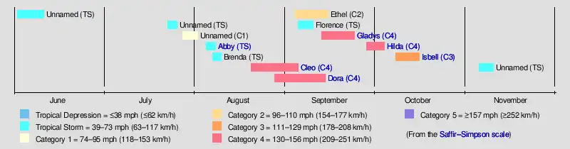 The first system, an unnamed tropical storm, developed on June 2.[3] It struck Florida as a tropical depression and then strengthened into a tropical storm while out at sea. The storm ceased to exist on June 11. Thereafter, the season went dormant for nearly seven weeks, as the next cyclone, another unnamed storm, did not form until July 23. This would be followed by the development of a third unnamed system on July 28. Tropical cyclogenesis increased in August, which had four tropical cyclones, Abby, Brenda, Cleo, and Dora. The strongest storm of the season, Cleo, peaked with maximum sustained winds of 150 mph (240 km/h) and a minimum barometric pressure of 938 mbar (27.7 inHg). Four additional storms originated in September, including Ethel, Florence, Gladys, and Hilda. Hurricane Isbell was the sole tropical cyclone to form in the month of October. The final system, another unnamed storm, existed developed on November 5 and dissipated on November 10.[3]
