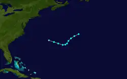 While situated about 300 mi (485 km) east of Bermuda on July 31, it began heading northeastward. Later that day, the depression finally organized further and developed a well-defined rainband. The Atlantic hurricane database indicates that the depression strengthened into a tropical storm at 18:00 UTC on July 31, due to ships reports of winds reaching 46 mph (74 km/h).[11][3] On August 1, it intensified further into a hurricane. Around that time, maximum sustained winds peaked at 85 mph (137 km/h).[3] The storm continued moving rapidly northeastward and began to interact with a cold front.[11] It transitioned into an extratropical cyclone on August 2, while located about 525 mi (845 km) east of Cape Race, Newfoundland.[3]