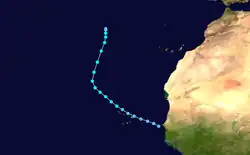 A tropical wave emerged into the Atlantic Ocean from the west coast of Africa on September 5.[8]: 183  The wave quickly developed into a tropical depression at 06:00 UTC on September 5, while located about 40 mi (64 km) west of Dakar, Senegal.[3] Shortly later, the depression produced squally weather in Cape Verde.[8]: 183  The depression then re-curved northwestward and began to intensify. At 00:00 UTC on September 7, the depression strengthened into Tropical Storm Florence. About twenty four hours later, the storm attained its maximum sustained wind speed of 45 mph (72 km/h). Florence then curved north-northeastward later that day and slowly weakened.[3] A reconnaissance aircraft reported that Florence degenerated into an area of squalls to the south of the Azores at 06:00 UTC on September 10.[3][8]: 183