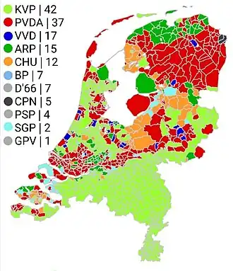 The elections led to a four-party centre-right coalition government being formed, consisting of the KVP, People's Party for Freedom and Democracy (VVD), Anti-Revolutionary Party (ARP) and Christian Historical Union (CHU), led by Prime Minister Piet de Jong.