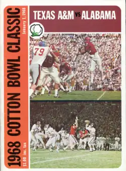 The 1968 Cotton Bowl Classic, part of the 1967 bowl game season, was the 32nd edition of the college football bowl game, held at the Cotton Bowl in Dallas, Texas, on Monday, January 1. It matched the eighth-ranked Alabama Crimson Tide of the Southeastern Conference (SEC) and the unranked Texas A&M Aggies, champions of the Southwest Conference (SWC). Underdog Texas A&M won the game 20–16.[2][3]