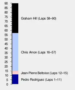 Lotus fate turned however during the race on Sunday, contested in searing heat.[1] Pedro Rodríguez took the lead at the start in his BRM, followed by Beltoise, Amon and Hulme. The Frenchman moved into the lead on lap 12, only to drop back four laps later with engine troubles. Amon was now back in the lead, followed closely by Rodriguez until the Mexican spun and crashed on lap 28. While he waited for his mechanics to pick up the car, spectators "descended on the car like vultures and stripped off the mirrors, seat, windscreen and nose cowling".[1] These retirements elevated Hill to second place behind Amon, who suffered a fuel pump failure on lap 58, handing Hill, who had been a mile behind,[1] first place and victory. Hulme was close behind Hill, but when his McLaren lost second gear, he needed to back off and the Englishman cruised home.[1][2] Beltoise recovered from his mechanical troubles and recorded the fastest lap of the race.