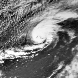 Moving northwestward, Debbie began re-intensifying on August 19, becoming Category 3 hurricane with winds of 115 mph (185 km/h) by 18:00 UTC. By 00:00 UTC on August 20, Debbie peaked with winds of 125 mph (201 km/h), which it maintained for a full day. The storm's minimum barometric pressure of 950 mbar (28 inHg) was measured by hurricane hunters during this timeframe.[2] Debbie curved northeastward as Hurricane Camille moved offshore the East Coast of the United States, weakening to a Category 2 hurricane early on August 21.[2] Gradually losing strength, Debbie passed well to the southeast of Bermuda,[16] although it is believed that if not for the presence of nearby Hurricane Camille, which emerged into the Atlantic from the United States on August 20, Debbie would have likely ended up further west, closer to the island.[17] Debbie accelerated and fell to below Category 2 intensity by 12:00 UTC on August 23. Six hours later Debbie became extratropical while still bearing hurricane-force winds, shortly before passing just offshore Newfoundland. The remnants of Debbie turned northeastward and deteriorated to gale strength late on August 24. About three days later, Debbie's remnants dissipated about 225 mi (362 km) east-northeast of Cape Farewell, Greenland.[2] In Newfoundland, wind gusts up to 85 mph (137 km/h) were observed in St. John's, while rainfall up to 0.98 in (25 mm) was recorded along the Avalon and Bonavista peninsulas.[18] The remnants of Debbie began to lose definition as they accelerated northeastward,[19] while moving over increasingly cold waters. Debbie's remnants finally dissipated west of Norway on August 27.[20][21][22]