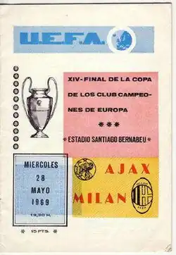 The 1969 European Cup final was a football match played at the Santiago Bernabéu Stadium in Madrid on 28 May 1969 between AC Milan of Italy and Ajax of the Netherlands, to determine the champions of the 1968–69 European Cup. Ajax made history by becoming the first Dutch side to reach the final, but they were beaten by their Italian opponents 4–1.[1][2]