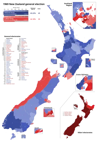 Through an amendment in the Electoral Act in 1965, the number of electorates in the South Island was fixed at 25, an increase of one since the 1962 electoral redistribution.[1] It was accepted that through the more rapid population growth in the North Island, the number of its electorates would continue to increase, and to keep proportionality, three new electorates were allowed for in the 1967 electoral redistribution for the next election.[2] In the North Island, five electorates were newly created (Birkenhead, Hamilton West, Henderson, Mangere, and Western Hutt) and one electorate was reconstituted (Waikato) while three electorates were abolished (Hamilton, Waipa, and Waitakere).[3] In the South Island, three electorates were newly created (Papanui, South Canterbury, and Wigram) and one electorate was reconstituted (Oamaru) while three electorates were abolished (Ashburton, Fendalton, and Waitaki).[4] The overall effect of the required changes was highly disruptive to existing electorates, with all but three electorates (Franklin, Wairarapa, and St Kilda) having their boundaries altered.[5] These changes came into effect with the 1969 election.[2]