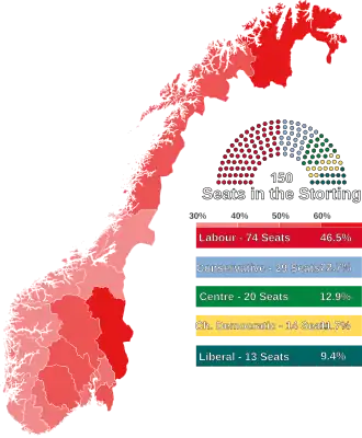 Parliamentary elections were held in Norway on 7 and 8 September 1969.[1] Although the Labour Party remained the largest party, winning 74 of the 150 seats, the coalition of right-of-centre parties won 76 seats and retained power. The closeness of the result and fears of the two blocs winning an equal number of seats led to the number of seats being increased to an odd number for the next elections.
