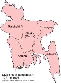 In the 1970s, Bangladesh used to be administratively divided into 4 divisions, namely Dhaka, Chittagong, Khulna and Rajshahi which were further subdivided into a total of 17 districts (See List of districts of Bangladesh). After the independence, President's Order 7 issued in 1972 dissolved all the existing local government bodies and the names of the Union Council and District Council were changed to Union Panchayet and Zila Board, respectively. The Constitution of 1972 included specific provisions relating to the basic structure and functions of local bodies. Article 9 provided for the formation of local bodies at every administrative units to be composed of elected representatives of the areas concerned.[40] In 1976, the Local Government Ordinance (LGO) issued by the government of General Ziaur Rahman made provisions for the formation of three types of rural local government, Union Parishad, Thana Parishad and Zila Parishad. In 1978, Jamalpur was upgraded to a District.