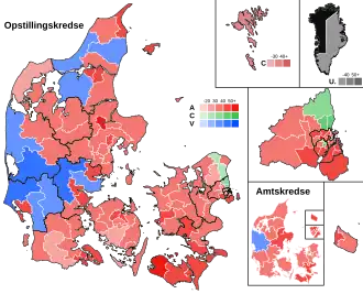 General elections were held in Denmark on 21 September 1971 and in the Faroe Islands on 5 October.[1][2] The Social Democratic Party remained the largest in the Folketing, with 70 of the 179 seats. Voter turnout was 87% in Denmark proper, 57% in the Faroe Islands and 52% in Greenland (where only one of the two constituencies was contested as the other had only a single candidate who was elected unopposed).[3]
