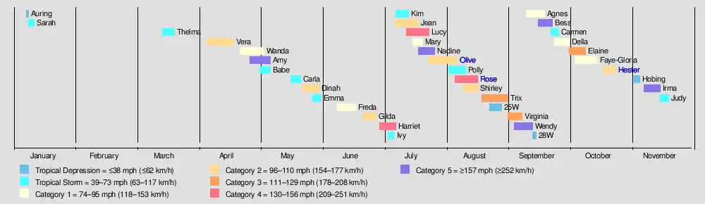 | Hester (Goying) | October 18 – 24 | Typhoon | 970 hPa (28.64 inHg) | Philippines, North Vietnam, South Vietnam, Laos | >$3.6 million | 119 | ||