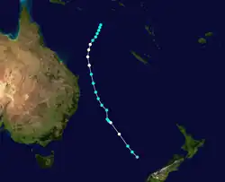 Tropical Cyclone Kirsty developed southwest of the Solomon Islands on 24 February. Heading generally southward, Kirsty dissipated well east of New South Wales on 1 March.