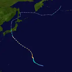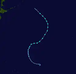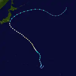 A tropical disturbance emerged from the ITCZ on July 29 and passed through the Marshalls. It became a tropical depression on July 30 and a tropical storm the next day. It and headed in the direction of Japan. Alice became a typhoon on August 2 and reached its maximum intensity on August 4 while southwest of Marcus. As Alice continued approaching Japan, it steadily weakened. It recurved, brushed Honshu, and went extratropical on August 8. It never made landfall.[10]