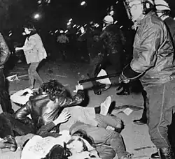 However, the call to end the strike provoked schisms within the Front Commun, and the passage of Bill 19 provoked significant backlash, leading to a number of wildcat strikes throughout the province.[13][14] On 9 May, Pepin, Lagerge, and Charbonneau were arrested on charges of having encouraged the members of their unions to continue striking and were sentenced to a year's incarceration.[15] The arrests of the union leaders sparked even further unrest across the province, leading to a number of wildcat strikes, notably in the town of Sept-Îles, which saw a general strike of almost its entire population from 10 to 17 May.[16][17][18] During the strike in Sept-Îles, the unions barricaded the Quebec Route 138 passing through the town and seized control of the town's airport and broadcasting station. Attempts by the province to fly in riot police failed to suppress the strike. On the first day of the Sept-Îles strike a vehicle-ramming attack was perpetrated by a local Quebec Liberal Party organiser on a crowd of workers gathered around the town's courthouse, injuring 35 and killing Herman Saint-Gelais, a 22-year-old metalworker.[19][20] Radio stations in twenty-two other towns across the province also saw temporary occupations, including in Montréal and in Saint Jerome, before being pushed out by police. In Montréal, on 11 May, protestors littered one of the city's bridges with nails, causing significant traffic delays.[21]