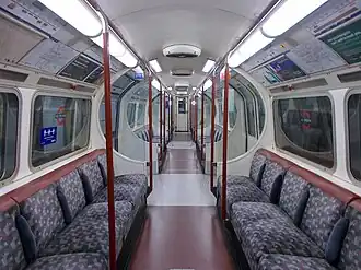 A further 33 trains of 1972 Tube stock were ordered to provide service on the Northern line. The 1972 Mark 2 stock had slightly different interiors with a dark blue seating moquette, unlike the red and grey on the earlier 1967 and 1972 cars. The biggest external difference was that the doors were painted red, with a London Transport roundel on the side of the carriages, rather than the Johnston lettering.