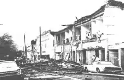 The tornado struck Decatur without warning around 2:45 p.m. CST. A severe thunderstorm warning was issued at 2:43 p.m., tornado sirens were sounded at 2:48 p.m., and a tornado warning wasn't issued until 2:56 p.m. by which time the tornado had cleared Decatur and dissipated near US 51.[28][23] Local police established two command posts and dispatched officers, including off duty and auxiliary, to Decatur for patrol duties. Fifteen firefighters were deployed to check for fires and assist with downed wires while the street division assisted with debris removal. Representative Edward Rell Madigan (R-IL) pledged all possible assistance to victims.[28] Electrical service was restored to the city by 8:00 a.m. on April 4, with the exception of 35 homes. Cablevision service remained offline due to damaged wires.[34] The American Red Cross set up a relief headquarters at Boling Springs Church of God with two coordinators assisting victims with federal assistance paperwork. A canteen operated by the Salvation Army provided food and Catholic Charities distributed clothing. The Council of Community Services was likely to head long-term relief efforts.[35] All roads in the city were cleared by April 5. The tornado prompted the addition of additional procedures to an in-the-works emergency preparedness program which would now include the Inspection and Public Works Department. Faster emergency medical response was identified as a pressing issue and plans to have a mobile headquarters were made.[36] The Macon County Fairgrounds president sought state aid to repair the facility.[31]