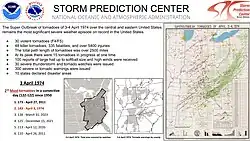 The 1974 Super Outbreak was one of the most intense tornado outbreaks on record, occurring on April 3–4, 1974, across much of the United States. It was one of the deadliest tornado outbreaks in U.S. history. It was also the most violent tornado outbreak ever recorded, with 30 violent (F4 or F5 rated) tornadoes confirmed. From April 3–4, there were 148 tornadoes confirmed in 13 U.S. states and the Canadian province of Ontario.[nb 1] In the United States, the tornadoes struck Illinois, Indiana, Michigan, Ohio, Kentucky, Tennessee, Alabama, Mississippi, Georgia, North Carolina, Virginia, West Virginia, and New York. The outbreak caused roughly $600 million USD (equivalent to $3.83 billion in 2024) in damage.[4] The outbreak extensively damaged approximately 900 sq mi (2,331 km2) along a total combined path length of 2,600 mi (4,184 km).[3][5] At one point, as many as 15 separate tornadoes were occurring simultaneously.[3][6]