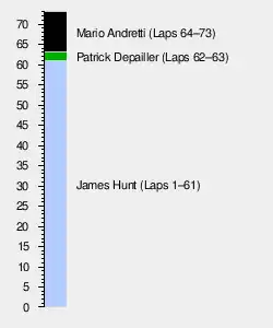 Hunt continued to lead, behind him second place passed between Andretti and Brambilla. On lap 22 Brambilla challenged for the lead but spun out of contention before retiring 15 laps later with electrical problems. Jochen Mass moved into second before crashing on the 36th lap just before turn 7, promoting Patrick Depailler into the position with Andretti third.