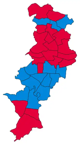 | Labour Party | 60,027 (45.1%) | 19 (57.6%) | 19 / 33