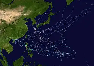 25 tropical storms formed this year in the Western Pacific. 14 storms reached typhoon intensity, of which 4 reached super typhoon strength.[1]