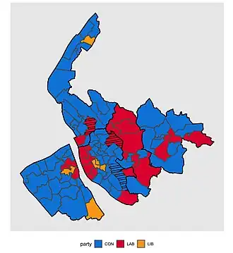 ![]() Map of Merseyside County Council showing wards won by party[2] | |||||||||||||||||||||||||||||||||||||||||