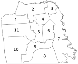 The 1977 San Francisco general elections occurred on November 8, 1977, for all 11 newly created electoral districts to be represented on the Board of Supervisors for the 1978 fiscal year, as well as the position of City Attorney, the position of City Treasurer and a roster of 22 propositions (an extra proposition had been withdrawn from the ballot).[1] It was the first time in San Francisco's history that Board elections were held on a districted basis rather than on a citywide at-large basis; in the November 1976 general election, voters in San Francisco decided to reorganize supervisor elections to choose supervisors from neighborhoods instead of voting for them in citywide ballots when they voted for Proposition T, which included the definition of the district boundaries.[2]