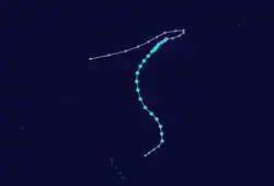 On 2 April, a tropical disturbance located east of the International Date Line began developing alongside a parallel cyclone, the precursor to Cyclone Wally, both inside the near-equatorial trough. Steadily tracking west, later that day, Carmen intensified into a tropical storm. A few hours later, as the system crossed east of the Date Line on 5 April, the JTWC issued their first warning on the system.[6] Later that day, the JMA designated the system as a tropical storm,[7] with the JTWC following suit a few hours later, naming it Carmen.[6] Steadily intensifying, the next day, both the JTWC and JMA stated that Carmen peaked with sustained winds of 60 knots (110 km/h; 70 mph).[7][6] Soon after, Carmen steadily weakened, and after tracking east of the Date Line on 7 April, both the JTWC and JMA stopped tracking the system.[6][7]