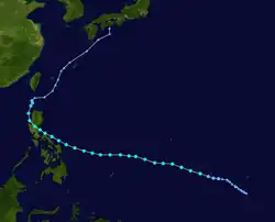 On 16 May, a tropical disturbance began developing west of Kosrae.[14] Three days later, the JMA designated the disturbance as a tropical depression,[7] with the JTWC issuing a TCFA on the system just a few hours after.[14] The next day, both the JMA and JTWC designated the depression as a tropical storm, with the latter agency naming it Forrest.[7][14] On 22 May, Forrest crossed into the PAR, being named Gloring by PAGASA.[3] Steadily developing, the next day, both the JMA and JTWC noted that Forest had peaked with sustained winds of 55 kn (65 mph; 100 km/h).[7][14] After making landfall in Luzon on 25 May, Forrest rapidly weakened,[14] and on 26 May, both PAGASA and the JTWC stopped tracking Forrest.[3][14] The JMA kept tracking a weakening Forrest until it dissipated on 29 May.[7]
