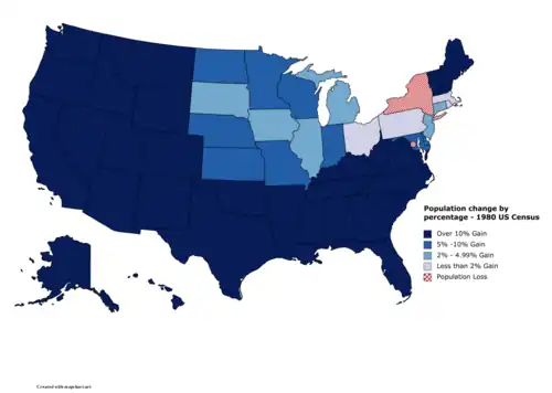 The 1980 United States census, conducted by the Census Bureau, determined the resident population of the United States to be 226,545,805, an increase of 11.4% over the 203,184,772 persons enumerated during the 1970 census.[1] It was the first census in which a state—California—recorded a population of 20 million people, as well as the first in which all states recorded populations of over 400,000. This was the first census to count Hispanic and Latino Americans as an ethnicity.