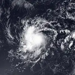 Floyd was first tracked as a tropical depression on September 3 when it organized east of the Leeward Islands. As the depression moved northwest, it caused heavy rain. The highest rainfall reported was 5.7 inches (140 mm) at Antigua. It strengthened into a tropical storm, then reached hurricane strength on September 7.[13] Floyd turned to the northeast and passed just southeast of Bermuda as a weakening hurricane. As a tropical storm, Floyd moved east across the Atlantic until losing its identity on September 12.[13]