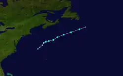 A cold front moved offshore North Carolina on July 30. An area of disturbed weather along the tail-end of the front subsequently began to develop cyclonic banding, resulting in the formation of a subtropical depression late on August 2 about 310 mi (500 km) northwest of Bermuda. After acquiring more central dense overcast, the subtropical depression transitioned into a tropical depression around 12:00 UTC on the following day. Soon, the depression also intensified into Tropical Storm Cindy late on August 3 about midway between Bermuda and Nova Scotia. Cindy tracked east-northeast until becoming extratropical on August 5 as it moved over colder sea surface temperatures to the southeast of Newfoundland.[9]