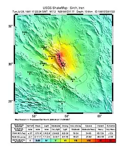 The 1981 Sirch earthquake occurred at 20:52 local time (17:22 UTC) on July 28. It had a magnitude of 7.1 on the surface-wave magnitude scale and a maximum perceived intensity of IX (Violent) on the Mercalli intensity scale. The epicentre was in the province of Kerman in eastern Iran. The earthquake caused the destruction of Kerman and serious damage to towns and villages in the surrounding area. The estimated number of deaths is 1,500, with a further 1,000 injured, 50,000 homeless, and extensive damage in the Kerman Region.