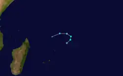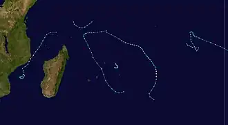 There were six storms named by the weather service in Madagascar or Mauritius, with advisories issued by Météo-France's meteorological office at Réunion (MFR).[1] At the time, the MFR area of warning responsibility was from the coast of Africa to 80° E, and the agency primarily used the Dvorak technique to estimate the intensities of tropical cyclones.[4] The Joint Typhoon Warning Center (JTWC), which is a joint United States Navy – United States Air Force task force that issues tropical cyclone warnings for the region,[5] also tracked a short-lived tropical storm in February, which formed on February 5 northeast of Mauritius. The system tracked to the southeast, reaching peak winds of 65 km/h (40 mph) before dissipating on February 8 northwest of Rodrigues.[6]