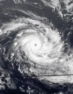 During March 27, the FMS started to monitor a depression that had developed, within a trough of low pressure about 235 km (145 mi) to the northeast of Penrhyn in the Northern Cook Islands.[23][24] Over the next couple of days, the system moved south-westwards and passed about 140 km (85 mi) to the southeast of Penhryn, as it gradually developed into a tropical cyclone.[23][24] The depression was subsequently named Tomasi by the FMS during March 29, after it had developed into a Category 1 tropical cyclone on the Australian scale.[23] After the system was named, Tomasi went through a period of rapid intensification, with an eye appearing on visible satellite imagery during that day.[23] It was also classified as a Category 3 severe tropical cyclone, before a tropical cyclone alert was issued by the FMS for Niue at around 23:08 UTC (11:08 FST, March 30).[23]