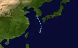 This system formed well north of the normal climatological position to the west of Dom, as the monsoon trough was similarly displaced. It was first noted on August 25, but showed no further development. Thunderstorms were located about 300 miles (480 km) south of the center, but since the central pressure was under 1000 mb, it was considered a tropical depression while an exposed low level swirl. The system did develop some central convection, and moved northward into South Korea, bringing showers to the region, and dissipated late on August 27.[17]