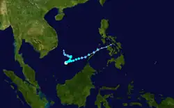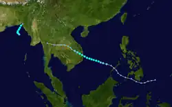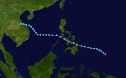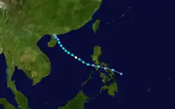 A tropical disturbance first noted east of the Philippines, the system moved through the archipelago as a tropical depression before strengthening briefly to a typhoon in the South China Sea. A combination of northeasterly vertical wind shear and proximity to land weakened the cyclone to a tropical storm before its landfall on Hai-nan and struck Chan Chiang, China as a tropical depression.[9] Winds peaked at 34 knots (63 km/h) at Tate's Cairn in Hong Kong.[1]