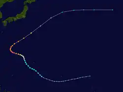 Wayne formed east of the Philippines, becoming the first super typhoon of the season before striking mainland China on July 25. Abby was a long-lived system, forming near Guam and remaining an intense typhoon for a number of days before recurving into Japan as a weakening tropical storm on August 17.[4] Ellen was a strong typhoon which tracked from the International Dateline westward near the northern Philippines and mainland China by September 9.[5] Forrest formed well east of the Philippines in late September, becoming the fastest-developing tropical cyclone on record for the western Pacific Ocean, with a pressure drop of 92 hectopascals (2.7 inHg) in a 24‑hour period. Marge was an intense typhoon which recurved well off the coast of Asia during the first week of November. Orchid was a long-lived and erratic tropical cyclone which moved slowly just east of the Philippines during late November, absorbing Percy along the way. Vera, Wayne, Kim, and Lex led to over half of the fatalities from tropical cyclones this season.[1][4]
