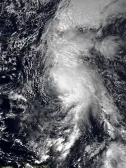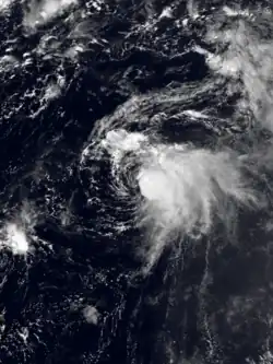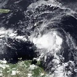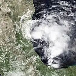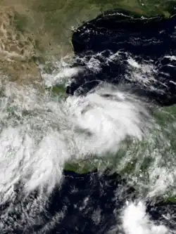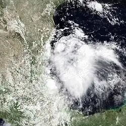 The origins of Tropical Storm Edouard are unclear, but an area of persistent organized storms formed in the Bay of Campeche, which strengthened into a tropical storm on September 14. Edouard rapidly intensified, with wind speeds reaching 65 miles per hour (105 km/h) in 18 hours as a faint eye feature became visible. Following its strengthening, Edouard dissipated even more quickly, degenerating into an area of thunderstorms the next day.[36] The remnants of Edouard moved over land near the port of Veracruz.[37]