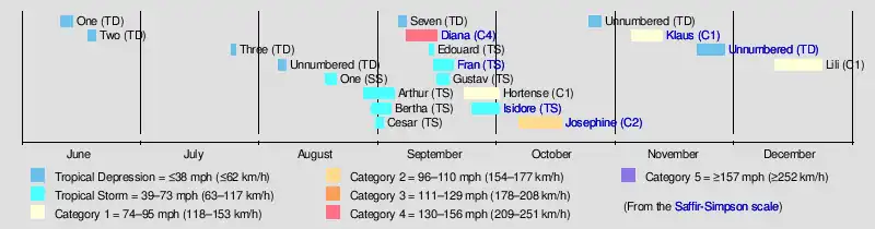Late November 1984 Nor'easterHurricane Klaus (1984)Hurricane Josephine (1984)Tropical Storm Isidore (1984)Tropical Storm Fran (1984)Hurricane Diana (1984)Saffir-Simpson scale