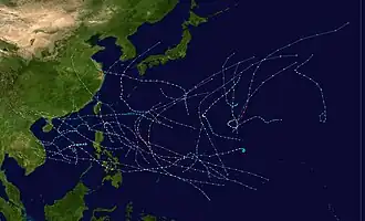Of the 27 tropical storms, 16 reached typhoon intensity, and two reached super typhoon strength. Eight tropical cyclones moved into mainland China, four struck Vietnam, four moved through the Philippines, and one cyclone moved into South Korea. The second consecutive typhoon season with a late start, all of the season activity was contained between June and December, with August and October the most active months, contributing to half of the seasonal tropical cyclone count.