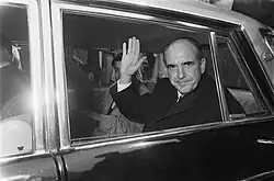 Georgios Papandreou and his political party, Center Union, having a moderate reformist platform, gained considerable traction and rose to power in elections of 1963 and later in elections of 1964.[29][32] He advocated for the liberalization of Greek society, which was rapidly urbanizing, resulting in large salary increases for police, judges, and teachers. Papandreou's government also released all the political prisoners as a first step towards healing wounds from the civil war.[33] However, seeds of resentment towards Papandreou from the military grew as they were excluded from salary increases.[34] He also made a faint attempt to gain control of the military, which alarmed many officers without weakening them.[35][36] The latter created friction with the King Constantine II, who wanted to remain in command of the army and not the elected government.[33] In the meantime, the son of Georgios Papandreou, Andreas Papandreou, who had joined Greek politics after 23 years in the United States as a prominent academic,[37] was campaigning by having fierce anti-monarchy and anti-American rhetoric, destabilizing the fragile political equilibrium.[38][39] Andreas Papandreou's militant and uncompromising stance made him a target of conspiratorial accusations from ultra-rightists who feared that following any new elections, which the nearly 80-year-old Georgios Papandreou would likely win, his son would be the actual focus of power in the party.[40] These incidents caused a dispute between Georgios Papandreou and King Constantine II, leading to the resignation of the former.[41]