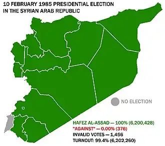 Presidential elections were held in Syria on 10 February 1985.[1] There was only one candidate, Hafez al-Assad, with voters asked to approve or reject his candidacy. A reported 99.99% of voters voted in favour, with a turnout of 94.53%.