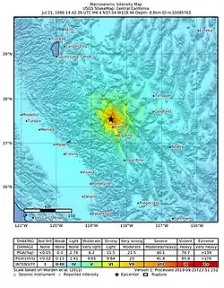 The day of the main event two aftershocks occurred (5.6 at 14:51 and 5.4 at 22:07) but the initial shock was V (Moderate) on the Mercalli intensity scale and the second event was felt only. Ten days following the mainshock on July 31, a stronger aftershock occurred with a local magnitude of 5.8 and a maximum Mercalli intensity of VI (Strong). That aftershock was felt in California and western Nevada, broke windows and knocked items off shelves in Bishop, and light fixtures were damaged at the National Weather Service office.[2][7]