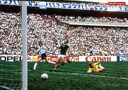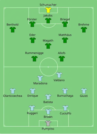 José Luis Brown opened the scoring for Argentina in the 23rd minute with a header after an error of the German Keeper Harald Schumacher on a free-kick from the right and it stayed at 1–0 until half-time. 11 minutes into the second half, Jorge Valdano doubled Argentina's lead with a low side foot finish after cutting in from the left past the advancing goalkeeper. Karl-Heinz Rummenigge pulled a goal back in the 74th minute from close range for West Germany, his first goal in the tournament. West Germany then equalised in the 81st minute, with Rudi Völler scoring with a header from close range. Although Diego Maradona was heavily marked by Lothar Matthäus throughout the game, his pass to Jorge Burruchaga in the 84th minute allowed Argentina to regain the lead at 3–2 when he slid the ball past the advancing goalkeeper from the right and into the corner of the net.[3][4]
