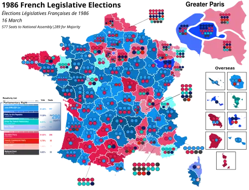 Legislative elections were held in France on 16 March 1986 to elect the eighth National Assembly of the Fifth Republic. Contrary to other legislative elections of the Fifth Republic, the electoral system used was that of party-list proportional representation.[1][2]