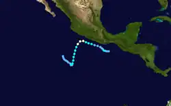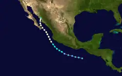 A tropical disturbance developed on September 27 within 250 mi (400 km) of the Mexican coastline.[2] The disturbance was upgraded into Tropical Depression Twenty-Three on 0000 UTC September 28. Tropical Depression Twenty-Three moved west-northwestward, lured poleward by an upper-level trough near northern Mexico. At 0000 UTC September 30, the depression became Tropical Storm Paine, southwest of Acapulco. Roughly 21 hours later, a NOAA Hurricane Hunter flight found winds of 90 mph (140 km/h), upgrading Paine into hurricane. The hurricane peaked as a Category 2 hurricane on October 1 as it turned northwest, headed towards the Gulf of California. Hurricane Paine did not intensify further due to the presence of mid-level wind shear and dry air.[2] The outer eyewall moved across Cabo San Lucas, and the resultant land interaction was believed to have slightly weakened the inner core of the hurricane.[31] Paine moved ashore near San José, Sonora with winds of 100 mph (160 km/h). The storm weakened as it moved over land going through Mexico and then entering the United States. Paine dissipated on October 4 over Lake Michigan.[2][32]