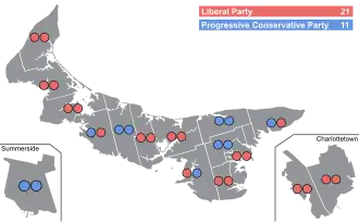 The election resulted in the defeat of the two-term Progressive Conservative government by the Liberals led by Joe Ghiz. Ghiz, the son of a Lebanese store owner, went on to become the first Canadian premier that was not of complete European descent.[3]
