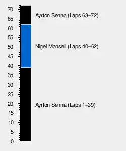 This race featured a 3 car battle for the lead over the last half of the race. Ayrton Senna (Lotus-Renault), Nigel Mansell (Williams-Honda) and reigning World Champion Alain Prost (McLaren-TAG) all had opportunities to take the win, with close nose to tail racing around the circuit. Once Mansell pitted for fresh tyres he charged back into the fight making up over 19 seconds in the final 10 laps on his fresh rubber. It was not quite sufficient to take the win, but it was very close with Senna and Mansell taking the chequered flag almost side by side, Senna only 0.014 s in front of Mansell in one of the closest finishes in Formula One history. This was the third-closest finish in Formula One history, after Mansell's spectacular charge allowed him to pull alongside Senna on the final straight.[1]