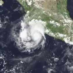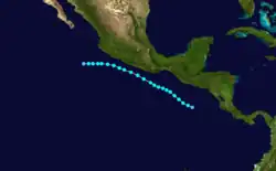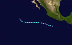Otis originated from the a tropical disturbance embedded in the monsoon trough. It moved over the warm waters south of the Mexican Riviera from September 17 to September 19. At 0000 UTC September 20, the disturbance was upgraded into Tropical Depression Nineteen-E while moving to the northwest.[5] It strengthened into a tropical storm later that day while located 950 mi (1,530 km) southwest of La Paz.[3] Eighteen hours later on September 21, Otis intensified into a hurricane.[5] It also began to turn back to the west and began to undergo a period of rapid deepening. On September 22, Otis reached its peak windspeed of 115 mph (185 km/h).[5] It would oscillate irregularly between that strength and Category 2 intensity until September 24.[3] That day, it began accelerating to the west as it lost strength due to increased wind shear and decreasing ocean temperature.[5] Otis fell to tropical storm strength on September 25 and a depression on September 26, and dissipated shortly after that.[3]