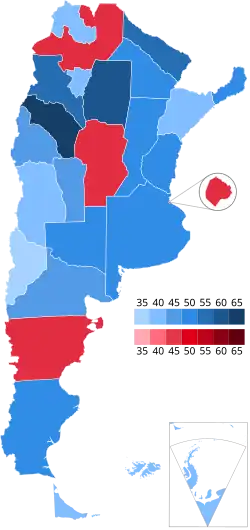 | Santiago del Estero | 195,471 | 65.49 | 2 | 87,920 | 29.46 | 1 | 2,394 | 0.80 | — | 3,219 | 1.08 | — | 9,469 | 3.17 | — |