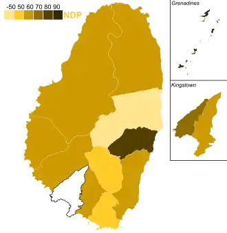 The 1989 election is also the most lopsided in terms of the popular vote margin since the country gained independence in 1979, with the NDP securing a 36-point victory over the second-placed Saint Vincent Labour Party. As of 2017, this is the last time that a single party won over 60% of the popular vote or more than 80% of the constituencies. It is also the last time that North Central Windward, South Windward, and Central Leeward have voted for the NDP.
